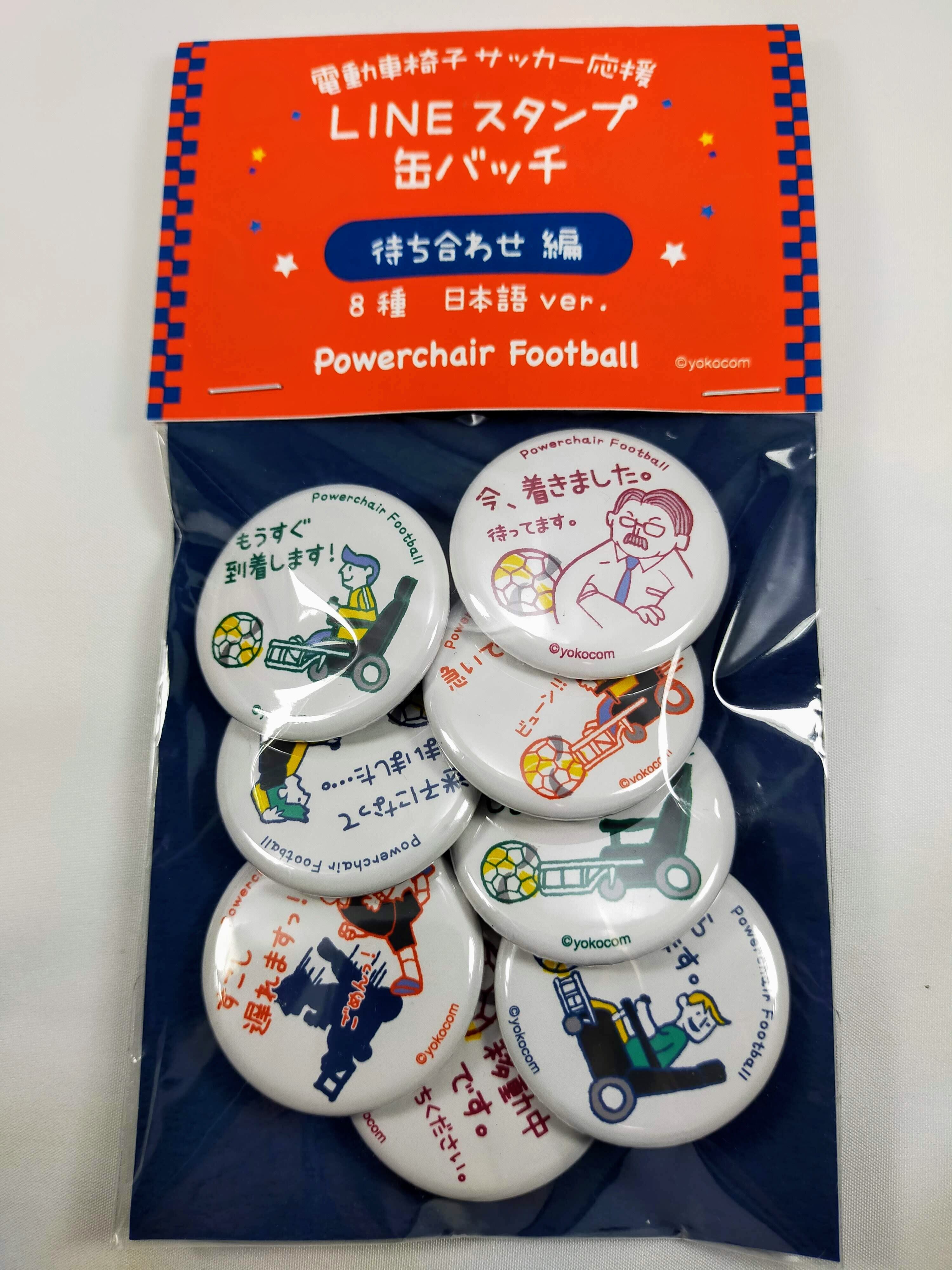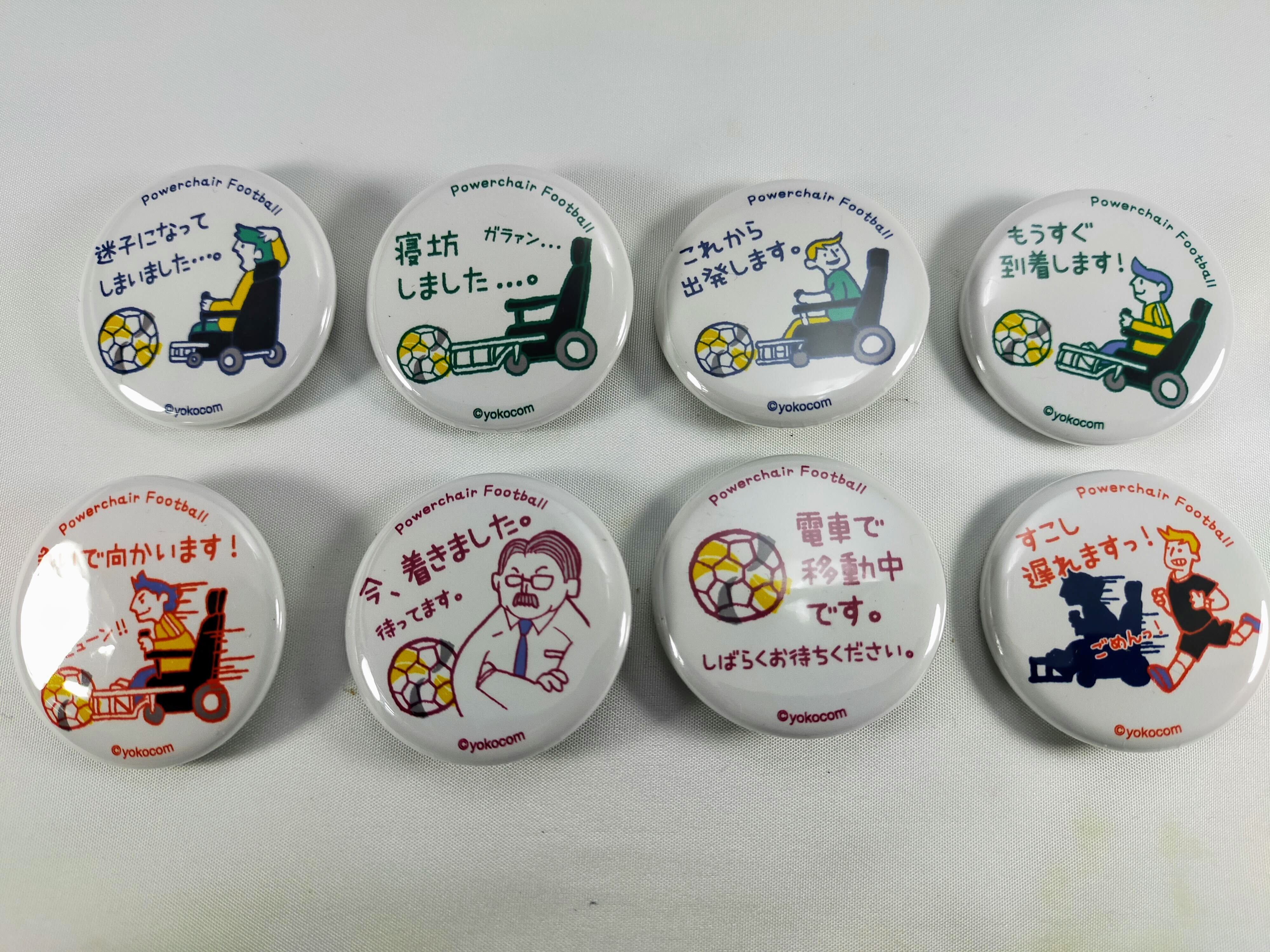 好評頂いています電動車椅子サッカーのLINEスタンプを缶バッチにしました。
